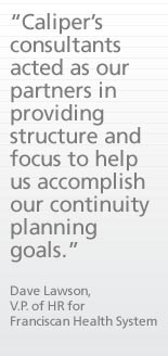 Franciscan Health SystemSuccession PlanningThe Client Franciscan Health System has approximately 5,500 employees, a medical staff with more than 1,200 members, and is part of a larger health system network with approximately 57,000 employees nation-wide. Background Franciscan was challenged by the parent organization to create a succession plan with leadership development as its primary objective. The executive leadership team had previously participated in some leadership training, but they now wanted to develop an on-site program for directors and mid-level managers. The Business Challenge With fifty percent of the executive team approaching retirement age within the next three to four years, and having no plan in place to fill these spots, they knew they needed to create a system for identifying and grooming potential leaders so they could move seamlessly into leadership positions as they opened up. Franciscan also wanted this system to help improve retention and quality of leadership by identifying leadership potential at the time of hire and actively developing high potential employees. With a new facility being built within the next year, they would need additional staff, and they wanted to be in a position to fulfill their stated mission of preparing future leaders for key positions in the organization. The parent organization had created some of its own competency models and tools for diagnosing leadership development needs, but their applications applied only to a few select executives at Franciscan’s facilities. So, our client wanted to build a plan that would take advantage of the existing tools provided by the parent, yet have a much broader application. In addition, they had been issued a “challenge” from the parent organization: Yearly bonuses would be contingent on the creation and implementation of a “Continuity Planning Program” within one year. Caliper’s SolutionThe first step was to ensure support for the succession management program from the President/CEO and the executive team. Meetings were held to present the challenges of promoting from within and the reasons for implementing a succession management program. Then, all members of the executive team completed their own Caliper Profiles and received direct feedback in order to gain appreciation for the tool as well as to enable Caliper to identify the talents of the organization’s existing leadership. A “Continuity Planning Committee” was formed out of members of the executive team. The committee worked with Caliper consultants to define the “Ideal Executive,” based on experiences, organizational knowledge, behaviorally defined competencies, personal attributes, and “derailers” or personality attributes that could cause people to fail. The Caliper Profile was administered to 105 eligible employees at the mid-manager level in order to select the initial group of future leaders. Additional names were kept in reserve to fill spots. Invitations to join this “Accelerated Development Program” were extended to and accepted by the high potential employees with the knowledge that opting out of the program was an acceptable response. A timeline was created that clearly outlined the steps and roles of the key players in implementing the succession management program. The process involved developing leadership competencies specific to Franciscan, training mentors and managers, creating a baseline process for filling open positions from within the organization, diagnosing development needs for high potential employees and implementing development plans, and introducing a Web-based, customized Talent Management System to track progress. The ResultsWith the initial creation and development phase of the succession planning initiative completed, the executive leadership group now has clarification on the competencies, values, and behaviors required of leaders who can succeed with this organization, as well as a template and tools with which to continue identifying, developing, and preparing their future leaders with minimal outside assistance. In addition, Franciscan was able to meet its parent company’s goals for continuity planning, resulting in financial compensation for the executive team and an enhanced preparedness for key position replacements, whether expected or unexpected. They now have the “bench strength” to fill openings at the senior level from existing staff, which will enable them to save time and money, as well as ensure that the incoming leadership shares the vision, goals, and values of the organization. As Dave Lawson, Vice President of Human Resources for Franciscan, shares, “Our Caliper consultants acted as our partners in providing structure and focus to help us accomplish our continuity planning goals. We integrated existing tools and competencies with Caliper’s assessments, training, and processes to create a program that has already resulted in an internal appointment to the executive leadership team.” |
